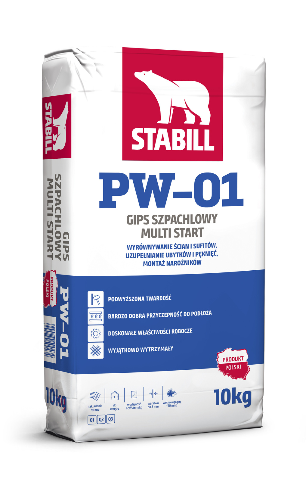 STABILL PW-01 to sucha mieszanka gipsu, wypełniaczy mineralnych oraz dodatków modyfikujących. Po zmieszaniu z wodą tworzy plastyczną masę o doskonałych właściwościach roboczych.
