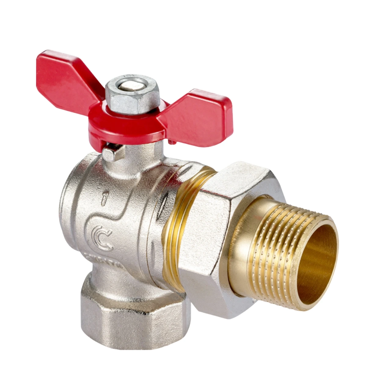 • Zawór kulowy GW/GZ, kątowy, z półśrubunkiem, z dławicą, uszczelnienie dynamiczne, uchwyt motylkowy (nr 1864)